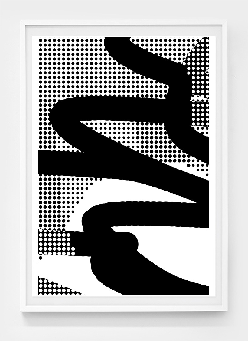 In dieser Arbeit aus der Serie "A Loop So Nice" entfaltet sich ein spannungsvolles Spiel aus Struktur und Fläche, aus Ordnung und Auflösung. Dichte Rasterpunkte, die an den klassischen Druckraster erinnern, verschmelzen mit kräftigen, schwarzen Formen zu einer grafisch kraftvollen Komposition. Das Werk bewegt sich an der Grenze zwischen digitaler Präzision und gestischer Abstraktion und erzeugt dadurch eine besondere visuelle Dynamik.